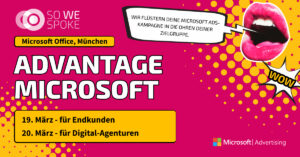 - Save the Date – 19. und 20.03.25!ADvantage Microsoft Auch im neuen Jahr setzen wir unsere beliebte Veranstaltungsreihe in den Microsoft Offices fort. Im März sind wir endlich wieder im tollen Office in München. Microsoft Deutschland GmbHWalter-Gropius-Straße 580807 München 19.03.25 – Tag 1: Endkunden Erlebe die neuesten Entwicklungen und Innovationen direkt aus der Welt von Microsoft Advertising. Tauche ein in die Zukunft… Save the Date – 19. und 20.03.25! weiterlesen